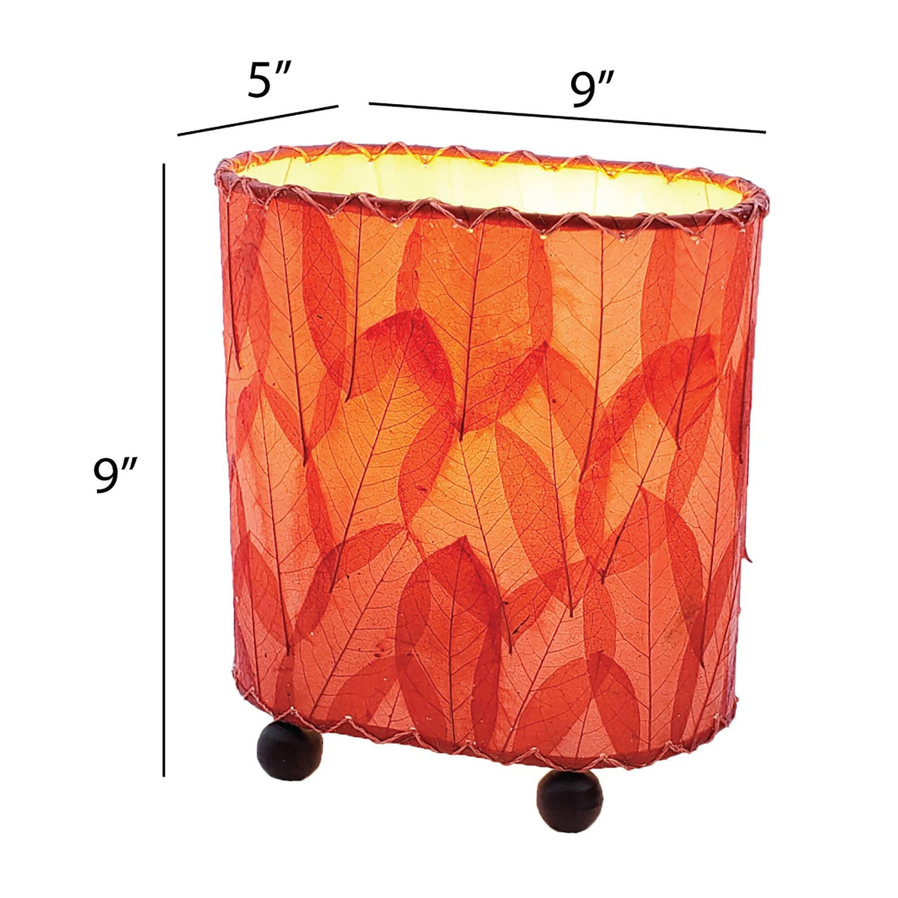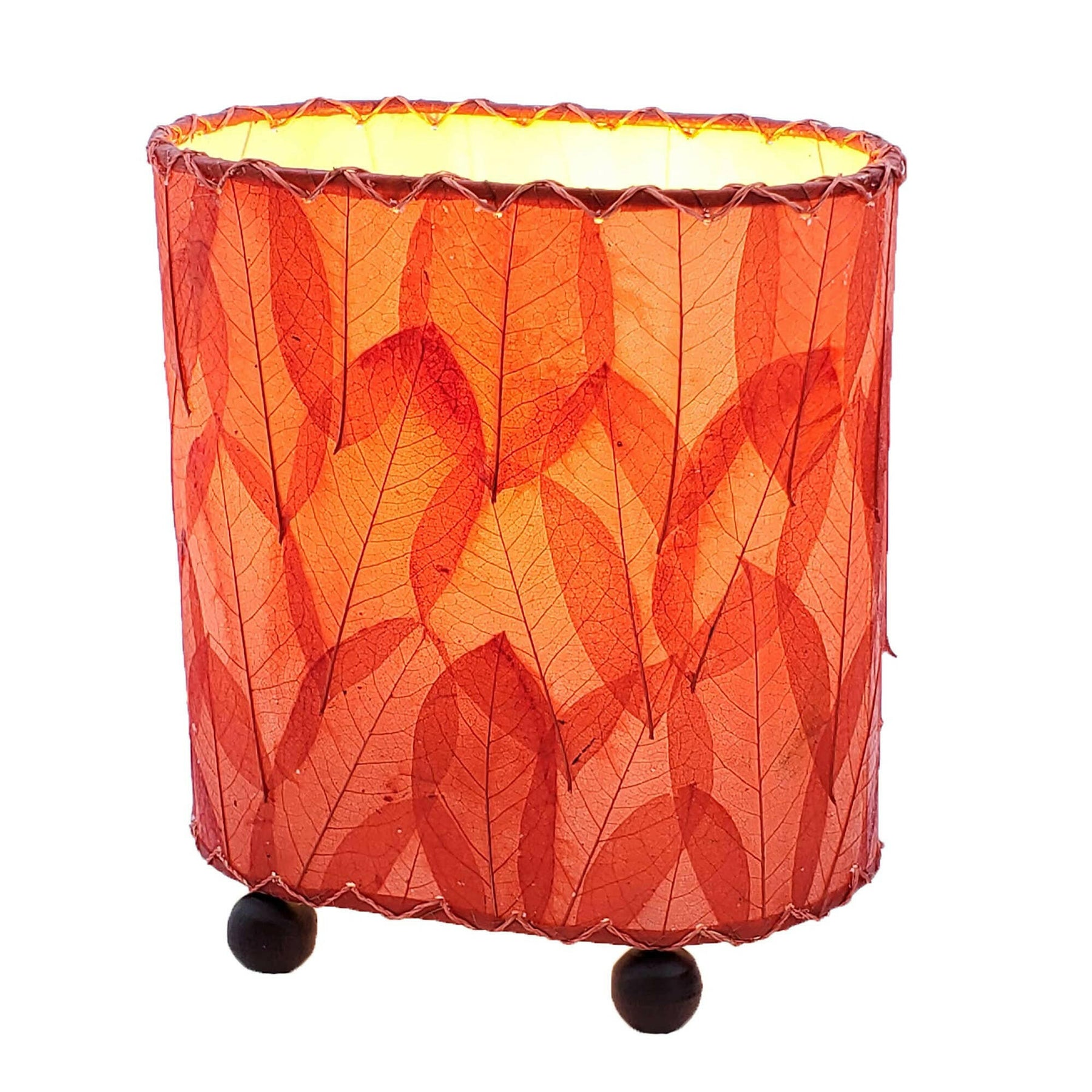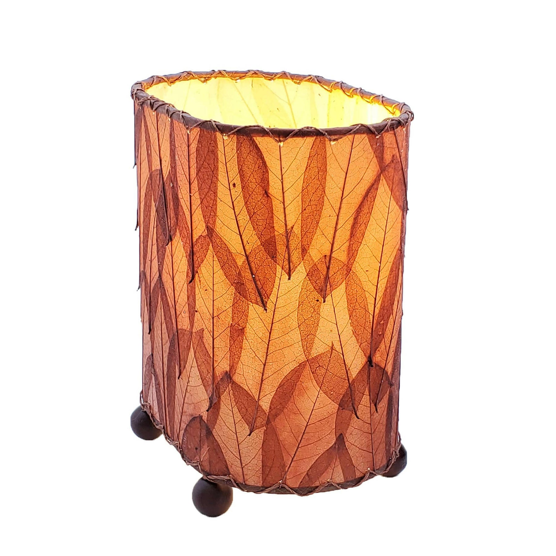 Small in scale but generous in light, this artisan lamp uses an elegant oval silhouette to cast warm, ambient illumination ideal for living rooms, bedside tables, or cozy corners. The exterior showcases overlapping, hand-placed guyabano leaves that create a natural, textured surface, while the upper interior of the shade is finished with fossilized cocoa leaves for a refined, high-quality look.