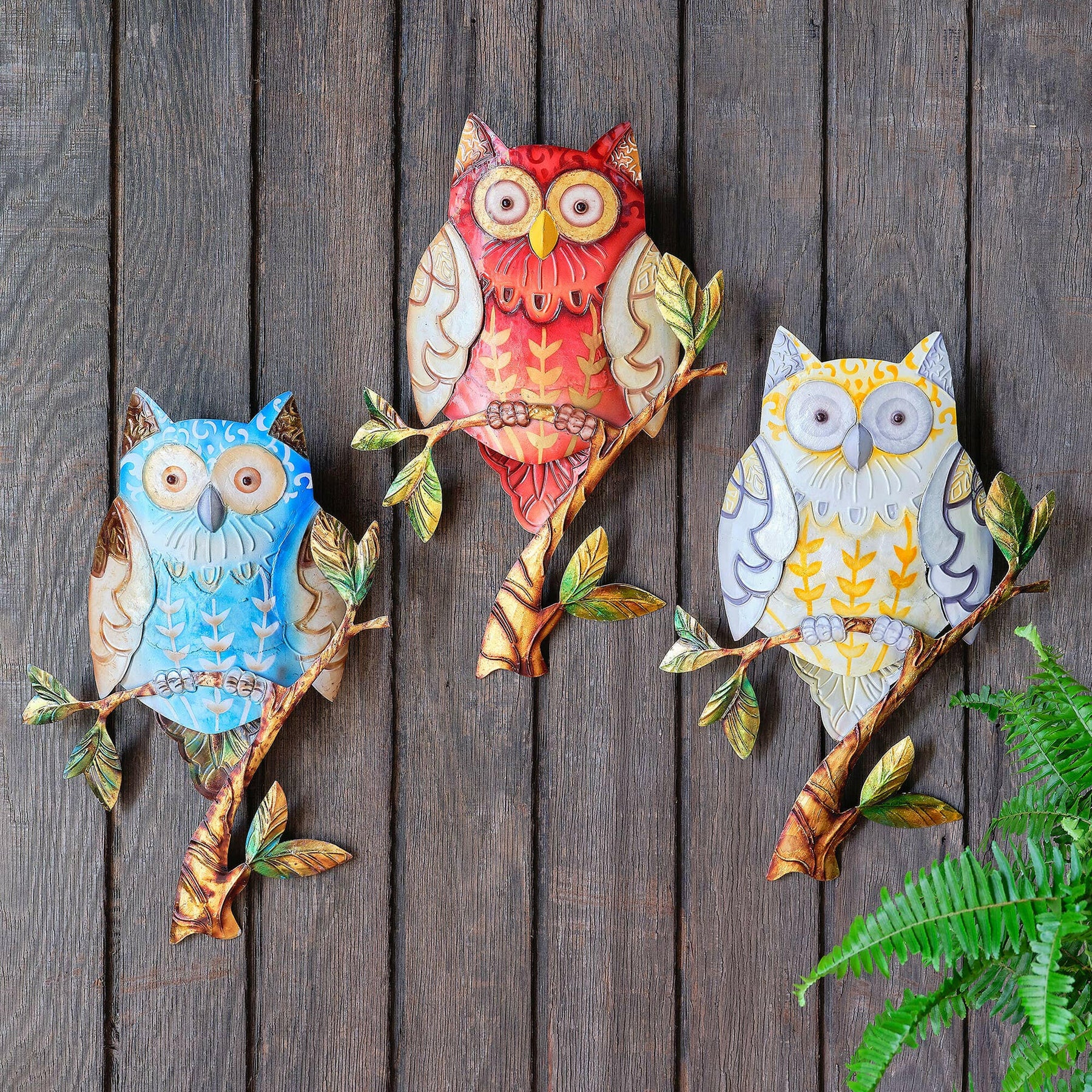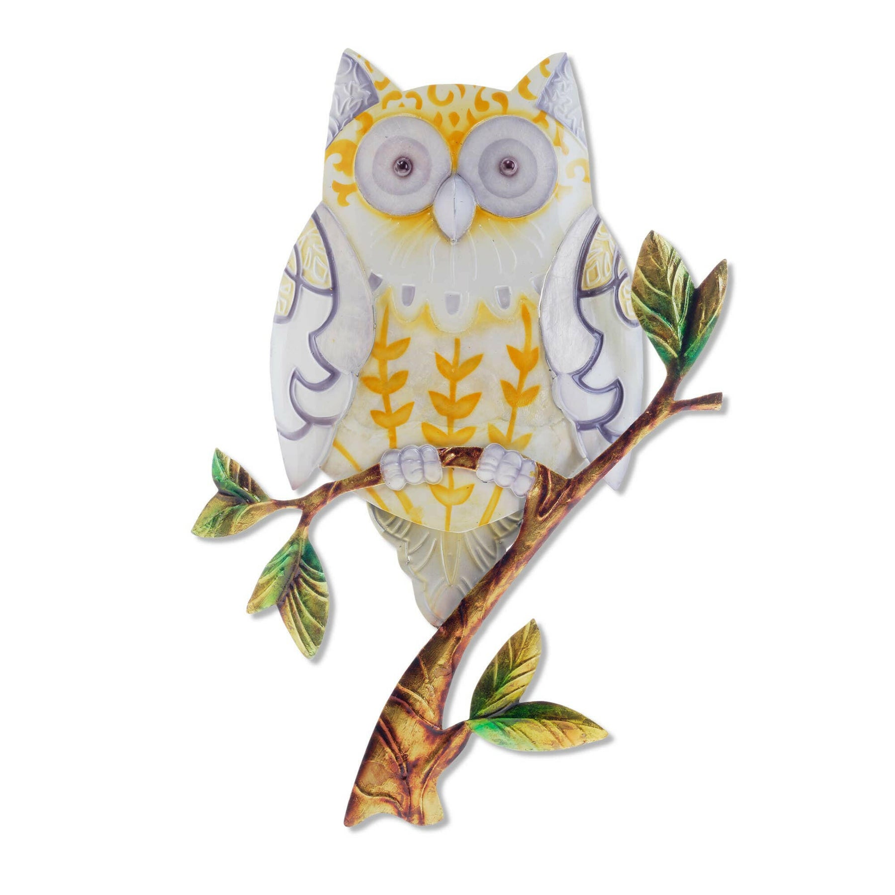 The owl was a bird of prophecy and wisdom in many ancient cultures. Its wide eyes seem to miss nothing and when an owl moves it seems calculated. Even though the colors and designs on the owl are human interpretations, the perched look is defiantly natural. The artist uses capiz shell on the wings to highlight the reflective nature of some of the owl's feathers