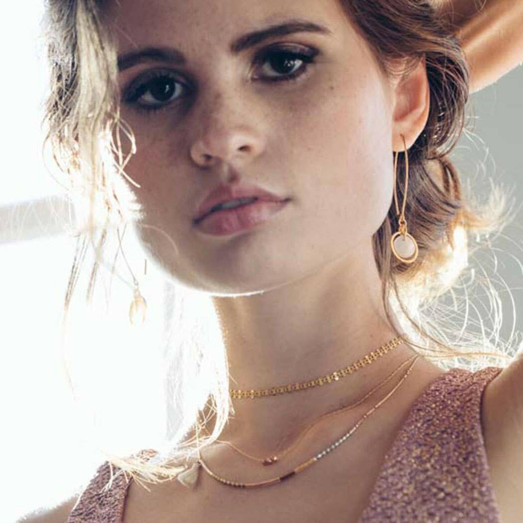 • Strung on a barley chain with 14k gold plating on brass