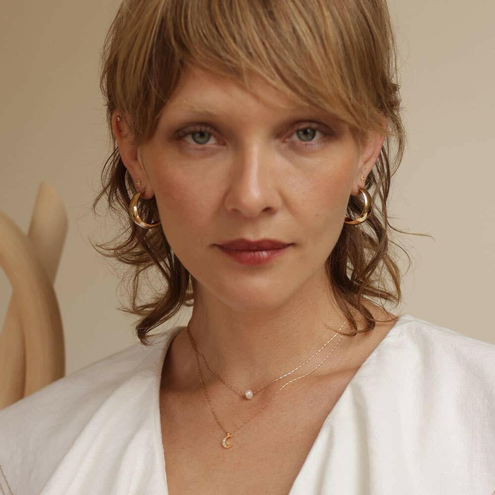 A delicate crescent moon charm set with three sparkling crystals hangs from 16" chain with a 2" extender. The chain is 14k gold plated brass + coated to resist tarnish and create a hypoallergenic surface. Charm measures just under 1/2". Designed and assembled in California.