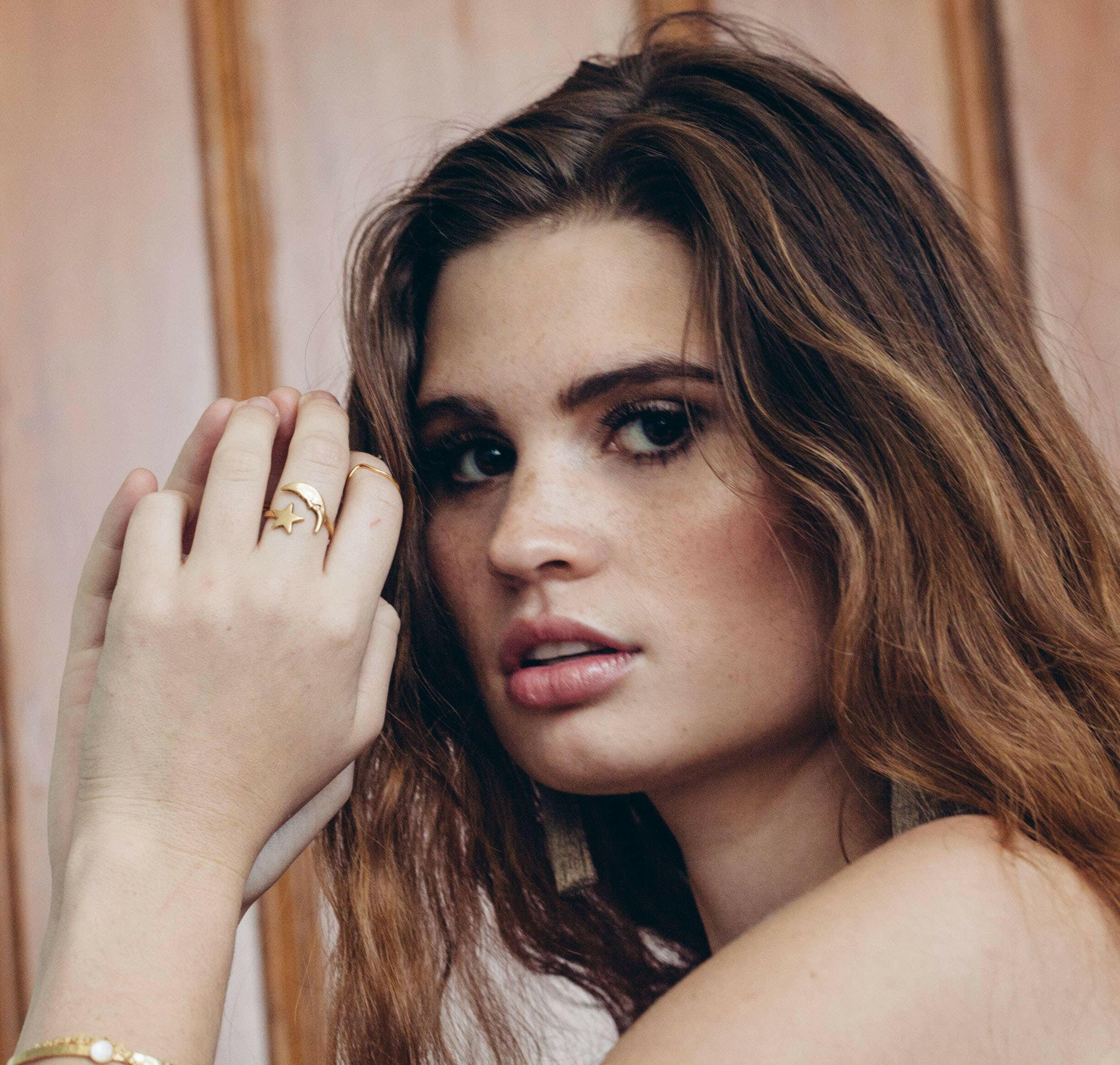 This crescent moon and star ring is cast in jeweler's brass and plated in a matte 14k gold. Cast as a size 7 but adjustable 1/2 size up or down. Designed in California.