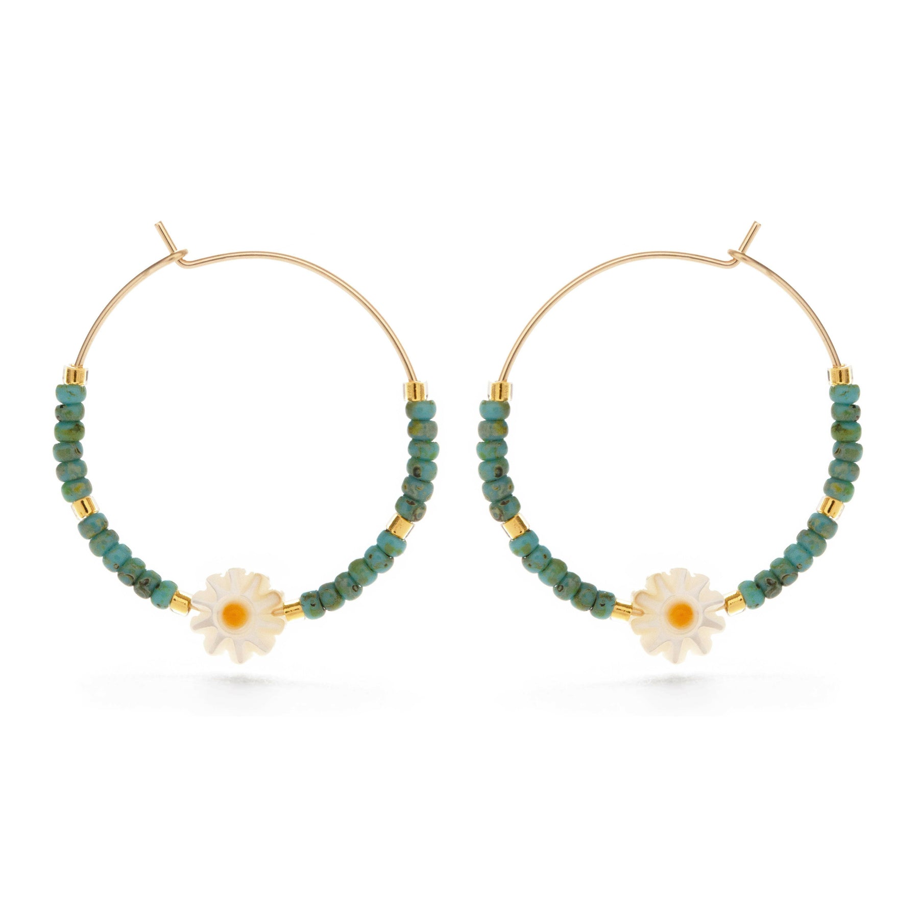 These cheerful hoop earrings will add a pop of color and fun to every day of the summer. 1 inch diameter gold fill hoops with a 6mm mother of pearl daisy and gorgeous Miyuki Japanese beads. Designed in California & made in Seoul, South Korea.