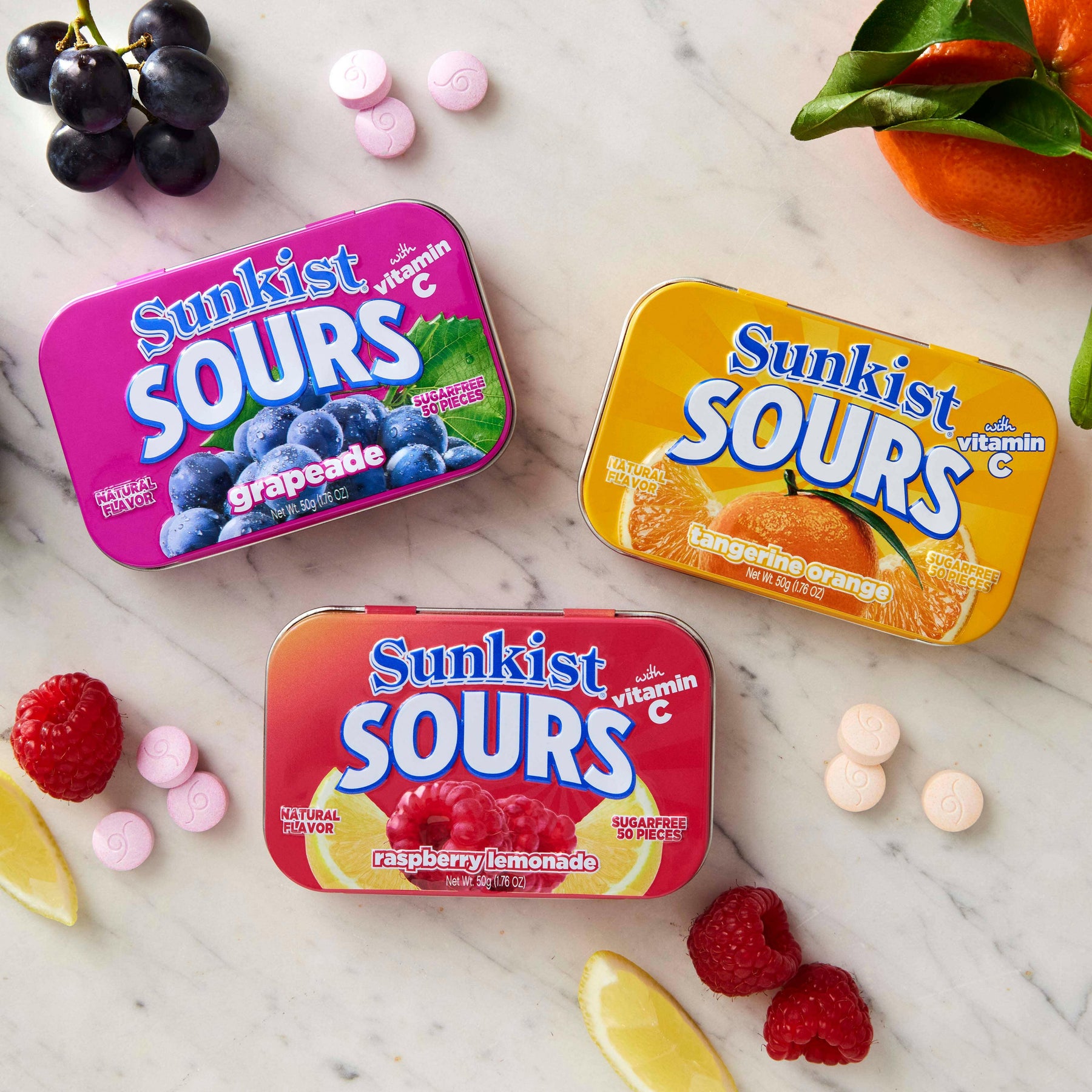 Sunkist Sours deliver delicious natural fruit flavor along with 100% of your daily value of Vitamin C, all in a convenient, go anywhere pack. In addition to being sugarfree, Sunkist Sours are also aspartame free, gluten free, peanut free and OU Kosher Certified.